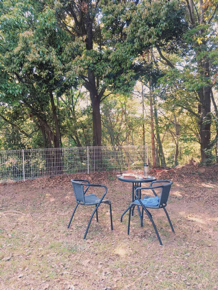 お庭を大掃除してぽっかり空いた日陰に休憩コーナー。ああ涼しい、癒される。それにしても何もない庭だな。置いてるのも水だし。