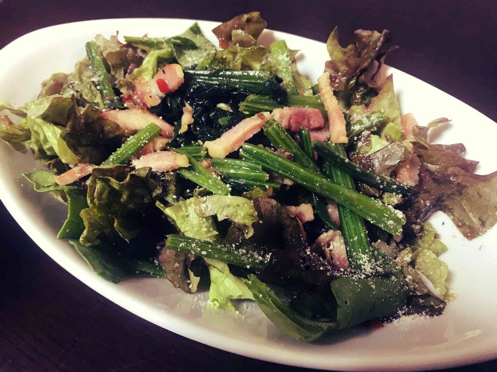 ルッコラのごまの香り?というか鉄分っぽいスパイシーな味と、ベーコンとほうれん草結構合います😋