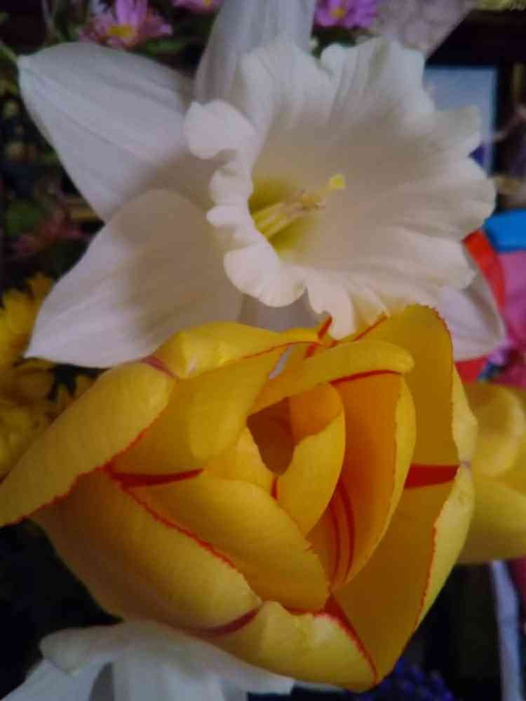 お庭で咲いていた、水仙とチューリップ切り花にしました。