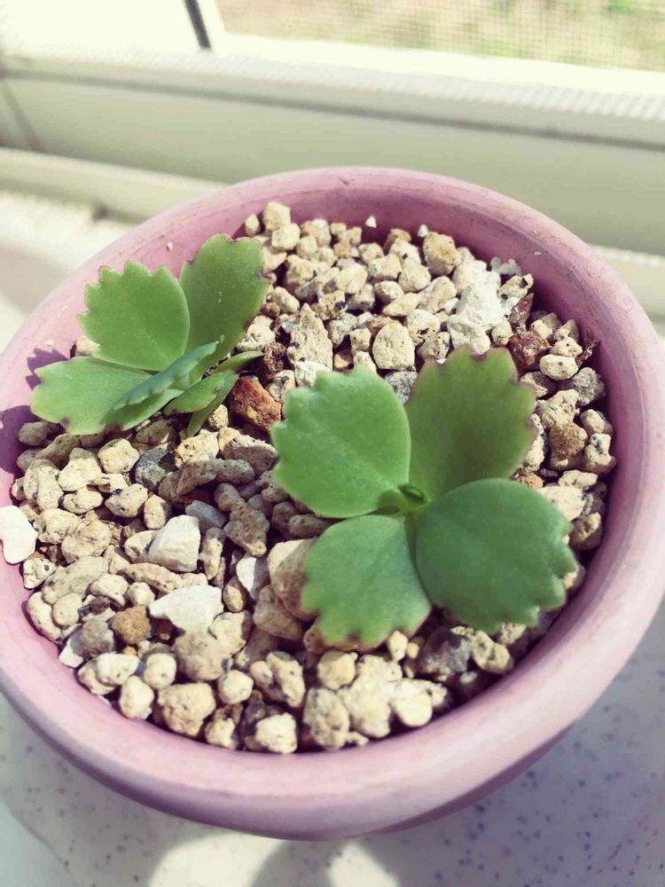 帰国したら子宝草が成長して、真ん中に小さな葉っぱが生まれてました❤️