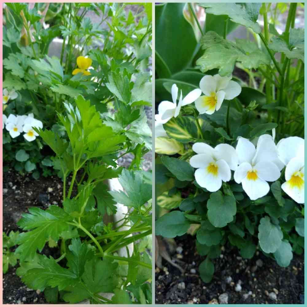 放っておいたらセロリ🌿が二株も生えて、斑入りの葉っぱ🌿のスミレが咲きました