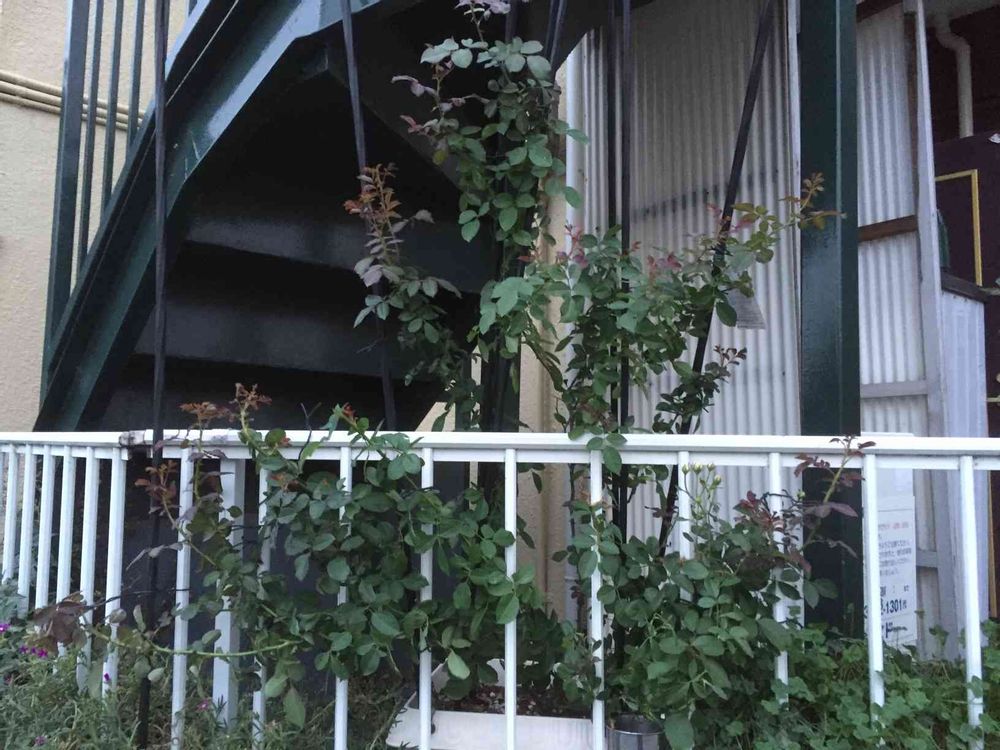 白いフェンスに誘引したくて。左フェンスの左側をいっぱいにしたい。