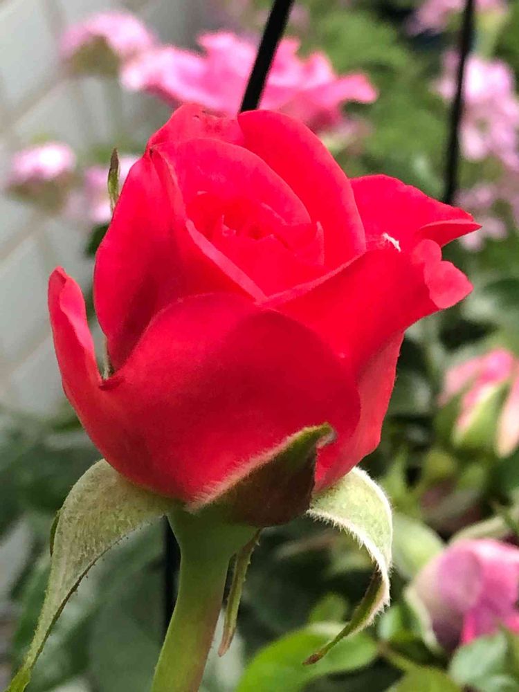今朝のバルコニーから。赤いミニ薔薇🌹が咲き出しました😊💕うちも薔薇の季節でーす。