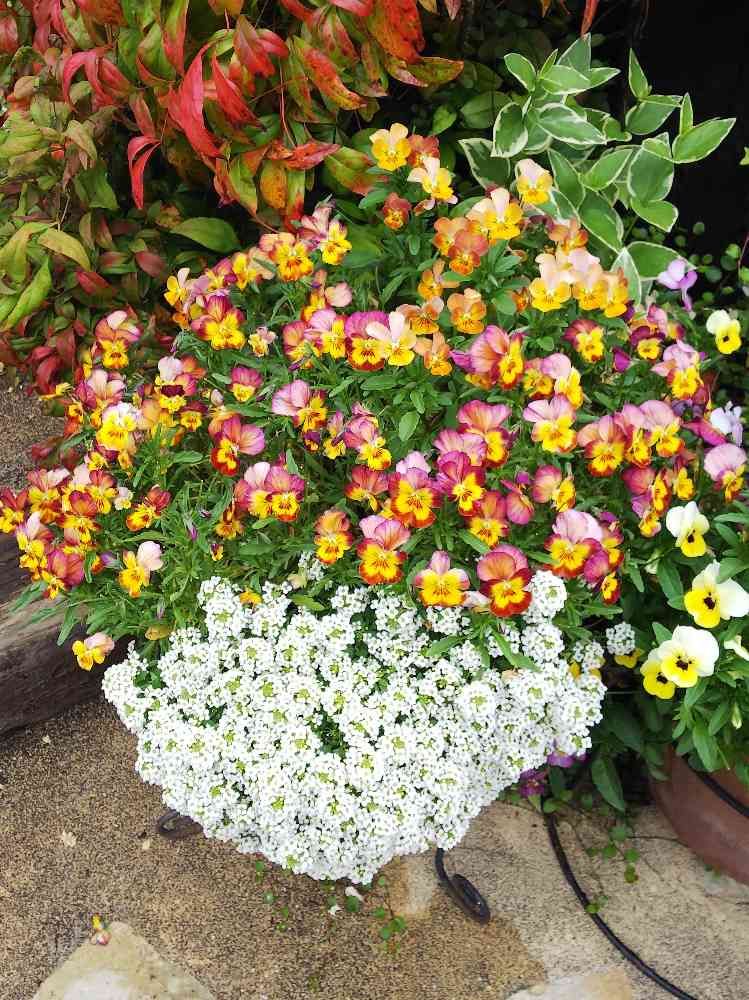 ビオラとアリッサムの寄せ植えが今頃もりもり💐です(*´∇`*)