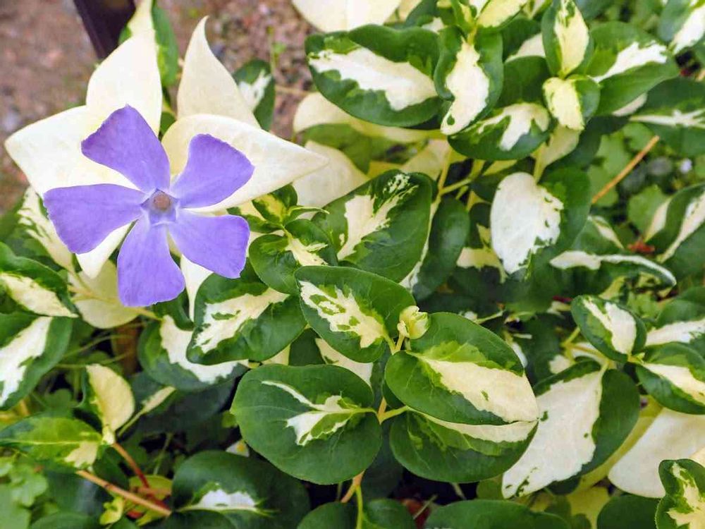 ツルニチニチソウ ・ワジョージェムです。普通の斑入りツルニチニチと違って、斑の入り方が中斑(外側が緑、内側はクリーム色の斑)になっていて、明るい印象です。花は同じようなブルーのお花で、この色が好きで一昨年苗を買いましたが、開花は初めてです😃