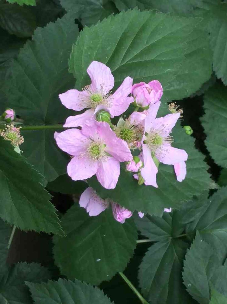 庭のあちこちにブラックベリーの花が咲き出しました。クマバチが色々な花びらに顔を突っ込んでいます。
