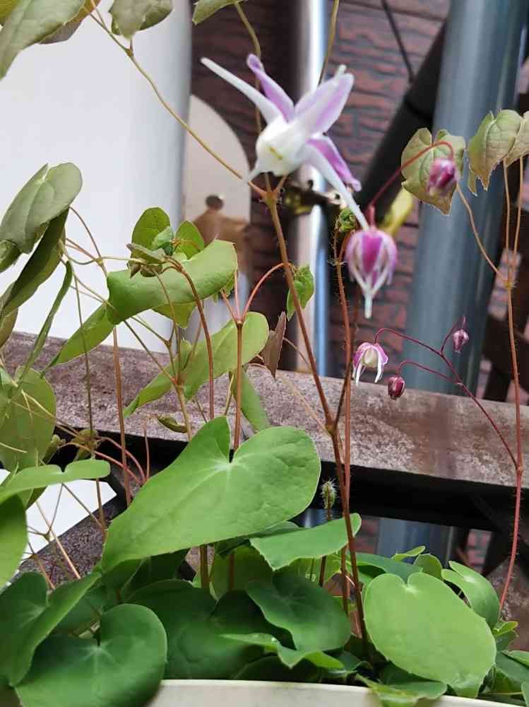 我が家、イカリソウ三種類目のイカリソウの「羽衣」かな?負けじと咲きました、白透明にくれない色は生えます❗️後ろはホームタンクです。明るい日陰雨除けありの一等席です。今二種類隣り合わせに、最初に咲いたのは近所でバイト(無料展示)しています。