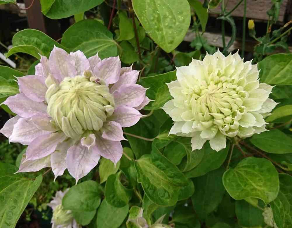 パテンス系の豪華な八重咲きクレマチスの共演は見事です。