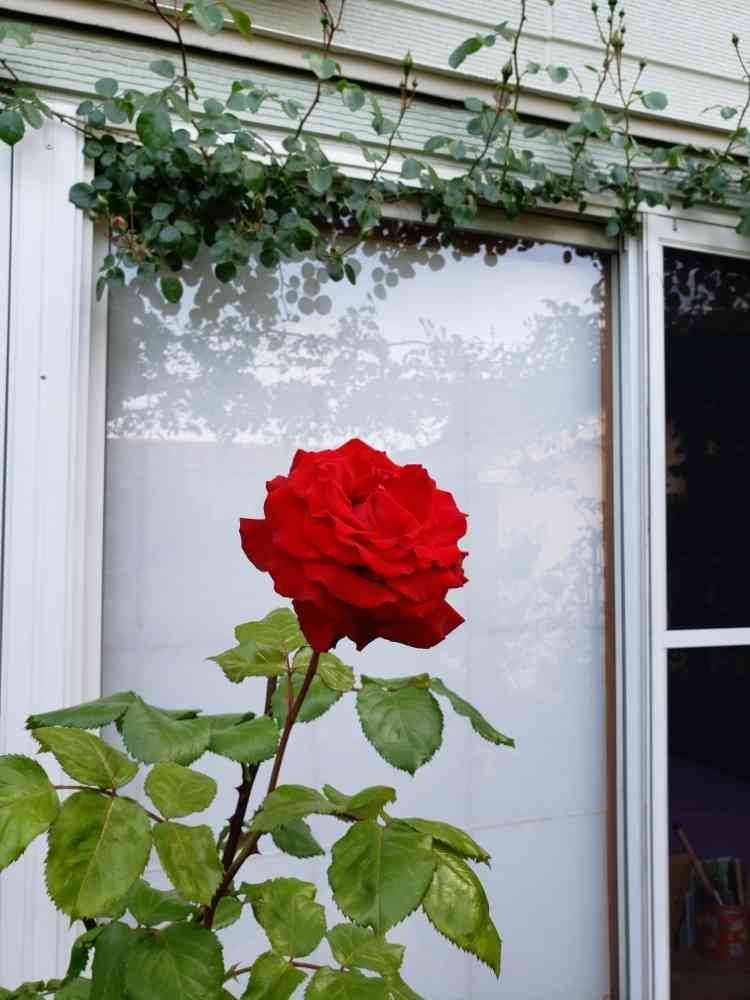 バラを休ませて、お礼肥をあげ、休ませます。四季咲きですから、もう休ませないと行けません。左隣に置いている「プリンセス・ドゥ・モナコ」が花芽を出し始めました。春のモナコは一番大きくて美しくて、香りもよいのです。「天空のバラの五線譜」ニュードーンが咲き始めると、石鹸のようなとても爽やかな香りに庭が包まれます。