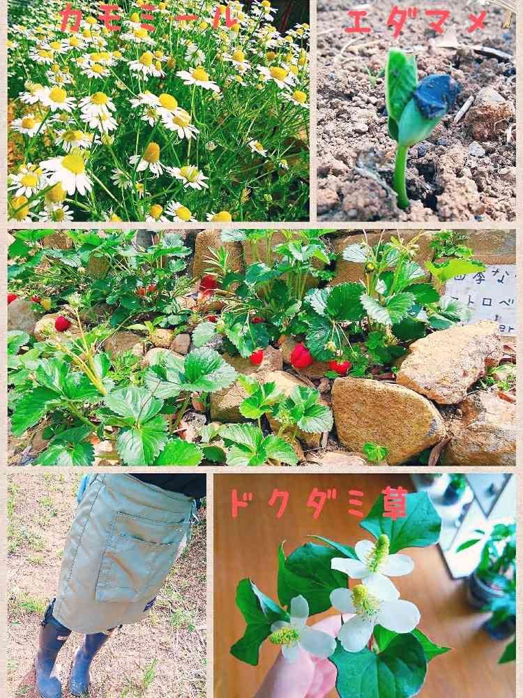 ルミさん こんにちわ~。農業エプロン姿も便利で格好いいですよ。枝豆出ましたね。あおい帽子かぶってる。こちらもかなりのお洒落ッティです。イチゴも四季なりですか?沢山なってますね。うちもドクダミが辺り一面目をだしてまして、御茶にするのに放っておこうか迷っています。花瓶に刺す考えは無かったので真似しよう。ルミさんの魔法にかかって厄介者の考えは捨てます。