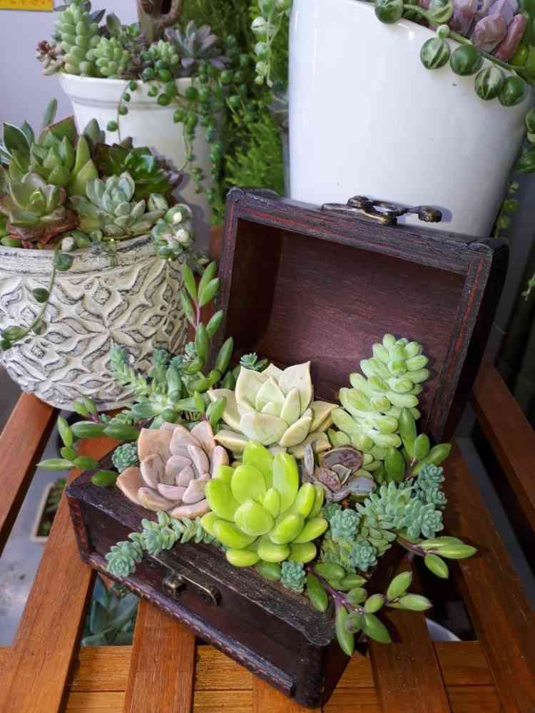 宝箱の寄せ植え♪とっても素敵ですね🎵☺この宝箱のミニチュアを持ってるのですけど、小さな多肉チャンが一つ入るくらいかな‼ 笑