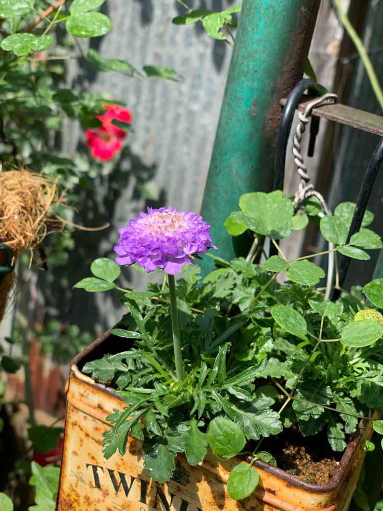 これも見切り品だったスカビオサ😅瀕死でしたが、ハイジさんの真似をして吊り缶カンにしたら機嫌よく咲きましたよ〜😃もう4年めです💜