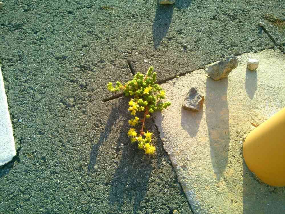 アスファルトの切れ目に根付いていた森村万年草が花を咲かせておりました。
