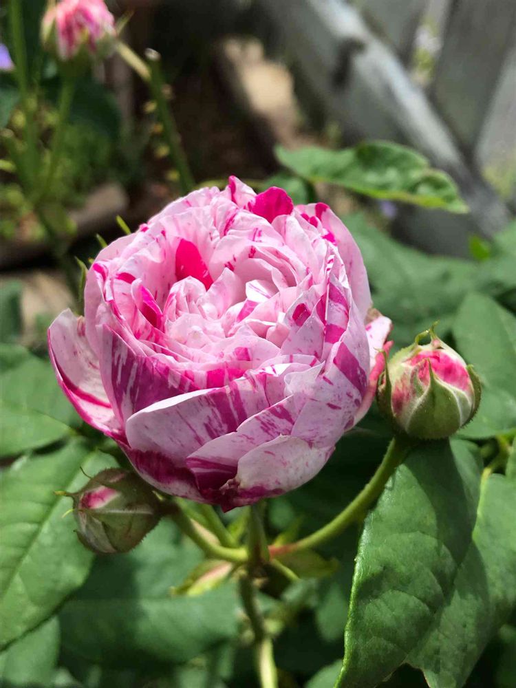 今朝のバラ🌹バリエガータディボローニャ💗去年は場所が悪かったのか全く咲かなかったけれど、今年は場所を移したらたくさん咲いてくれました💕絞りの模様が素敵な子です💕