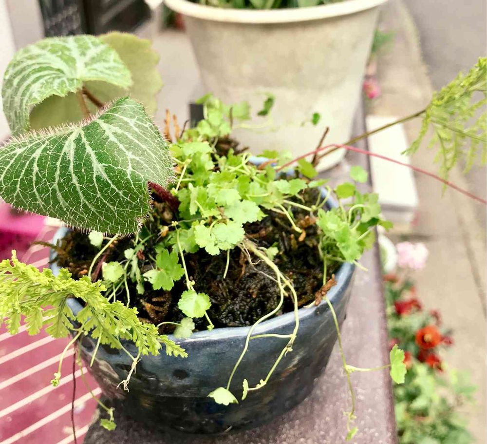 昔、義母が作った苔玉(生死不明)に、ユキノシタと庭の片隅に生えている氏名不明の草と、トキワシノブをごった植えしてみた。センスがないのが、苔玉に傷。