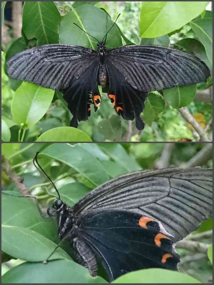 夕方、庭を眺めていると、昼間フワフワ飛び続けていたクロアゲハが再びやって来て、しばらくするとサンシュユの葉に止まりました❕その後、強い風が吹き、風に流されて今度はソヨゴの葉へ~🎵