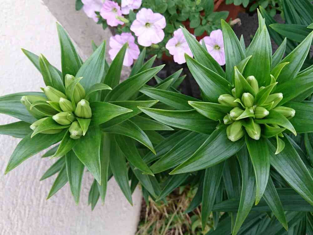 テッポウユリのつぼみ。準備完了❗。ピンクなのはペチュニア君です。白いラッパが楽しみ💓