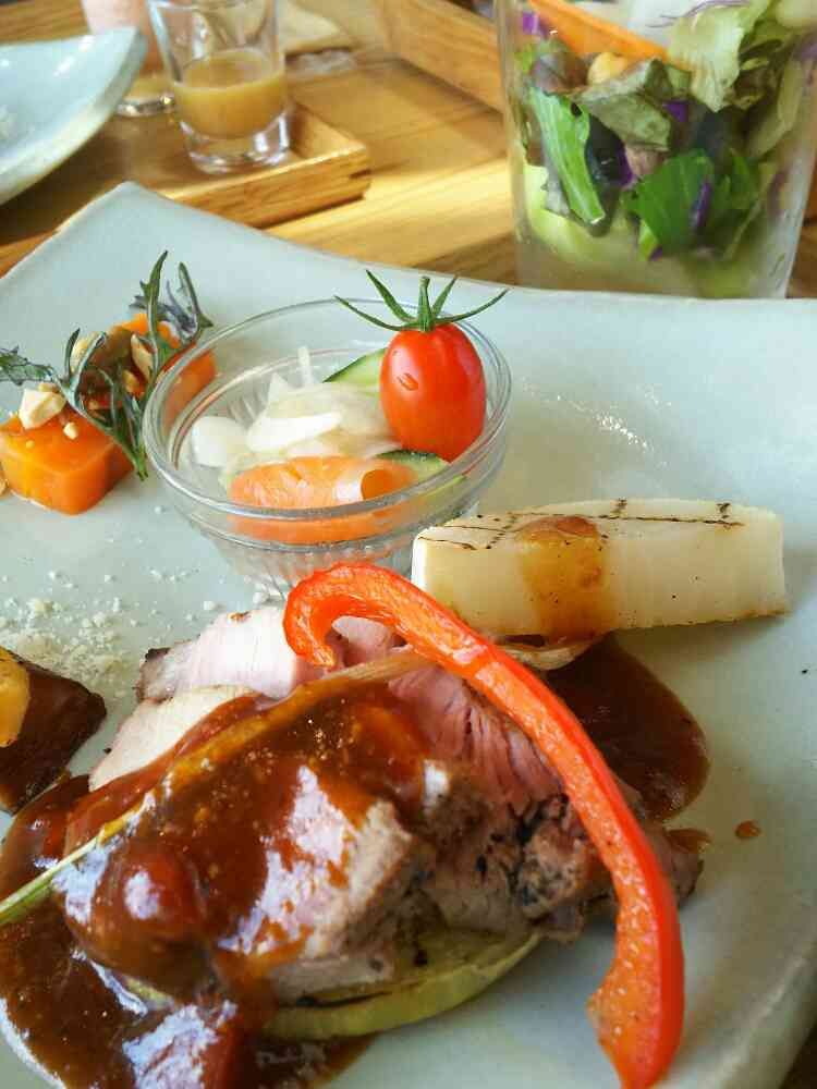 メインはローストポークとグリル野菜、玉葱・大根・人参・パプリカ・・・