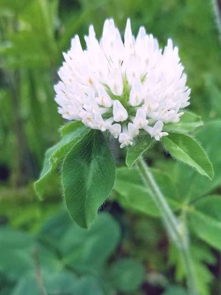 白い花のアカツメクサがいました😄葉っぱがそう言ってました。ひとりで大笑いです🤭