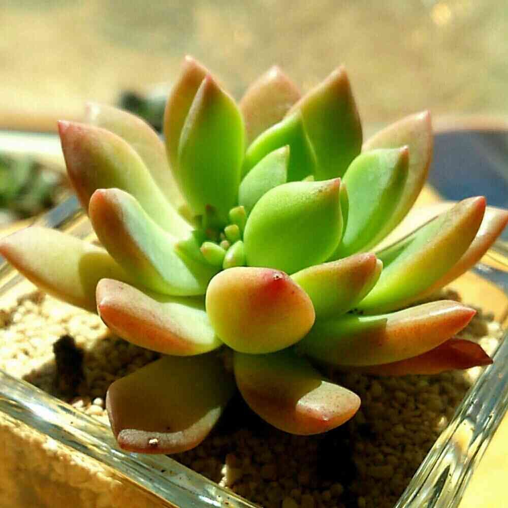 赤く色づいてるのに、だんだん夏に向かってミドリンになっちゃうんですよね〜…会社に持っていってある寄せ植えの中にも入れてあるんだけど、しっかりミドリンになってきてて、ちょっと徒長し始めてます💧もう少ししたら、持ち帰りをして寄せ植えし直すつもりですが…。