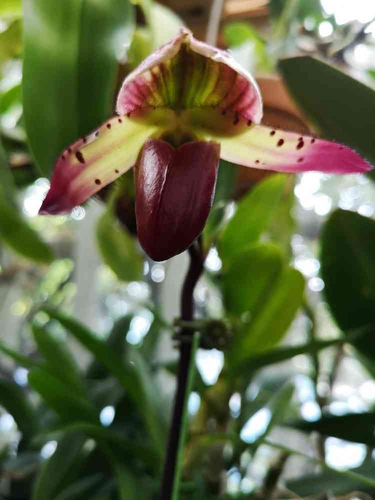 おはようございます。パフィオの二番花が咲きました。三番花も待機しています。皆様、よい一日を。