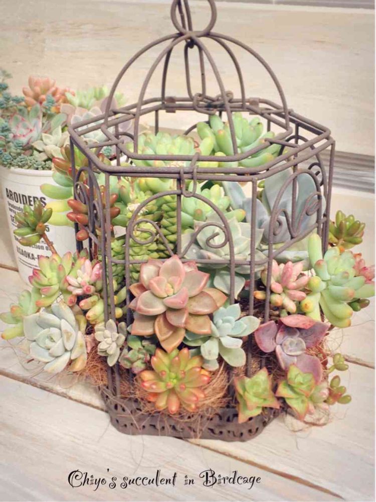 初めて鳥籠に寄せたので、暴れ多肉になったら中のはどうなるのか❓