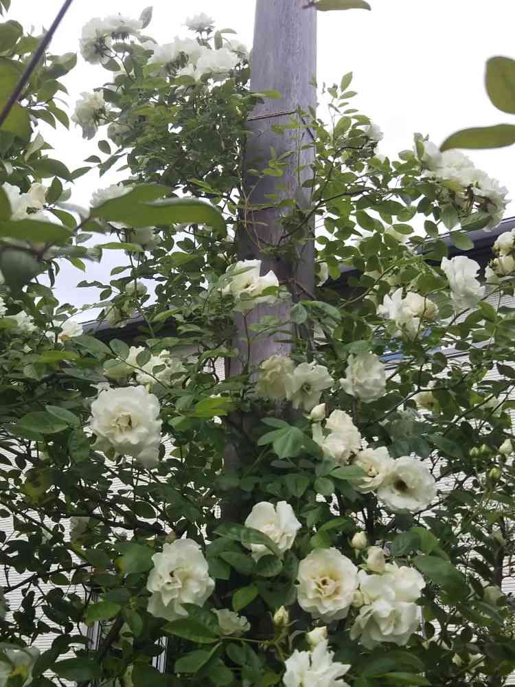 ポールに誘引したツルサマースノーがとても綺麗。ふわふわ揺れて可愛い❤️