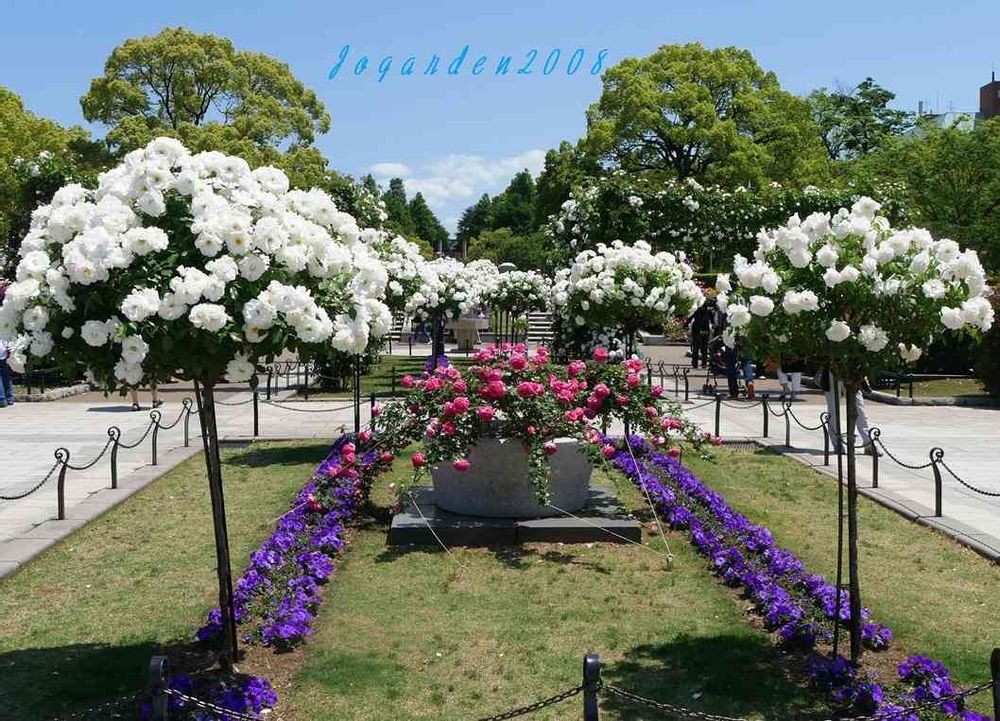 スタンダード仕立てのアイスバーグと、中心のピンク色のル・ポール・ロマンティークが満開でした。