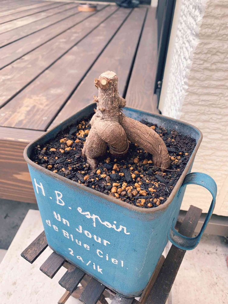 幹がしおしおで瀕死ぎみで心配だったので、大きめの鉢に植え替えて丸坊主に💦