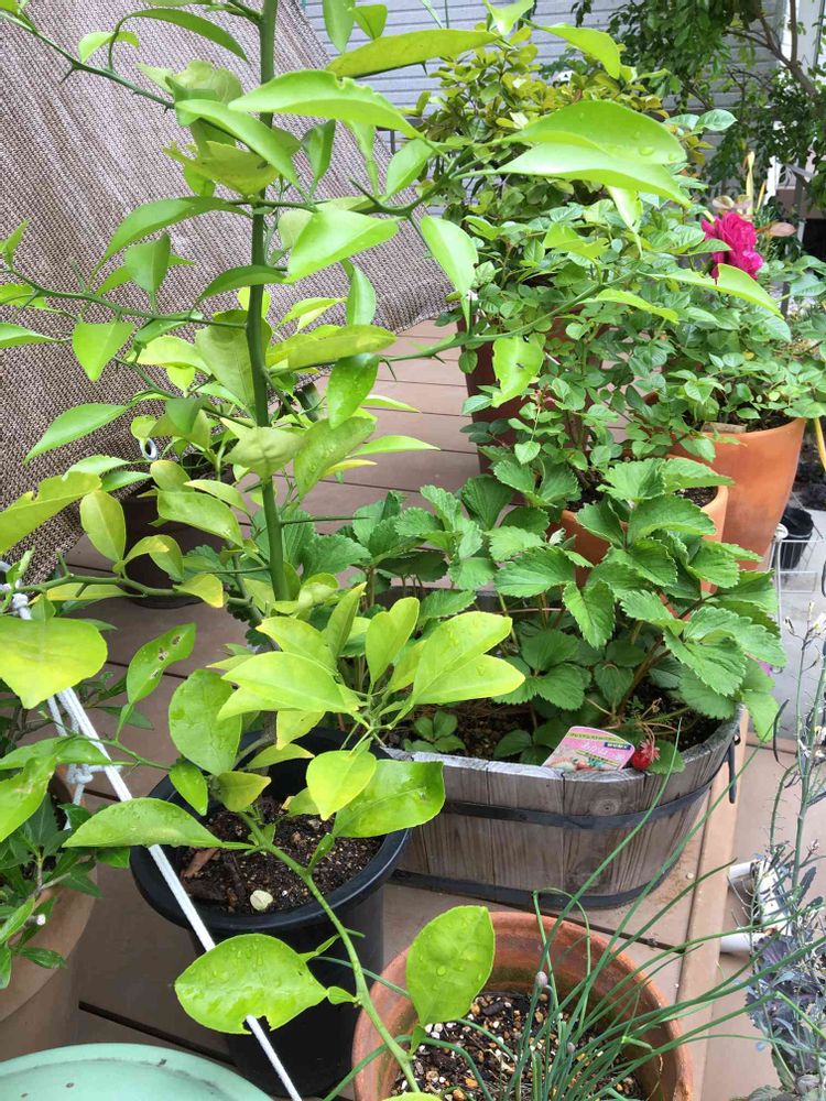 手前にあるのが友人に貰ったレモンの苗木です。そろそろ鉢増しした方がいいですね。まだ花も咲いていません。アゲハの卵らしきものがついているので、スプレーしています。