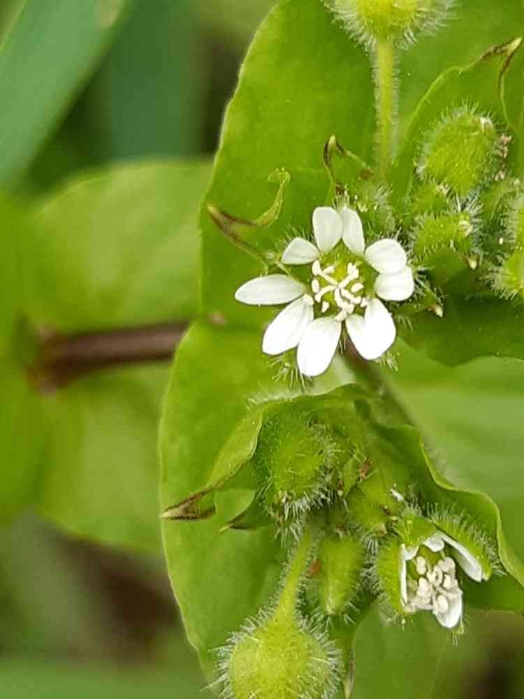 花の中央を見ると白い花柱が5本あるが、コハコベやミドリハコベといった他のハコベはこれが3本なので見分けられる。