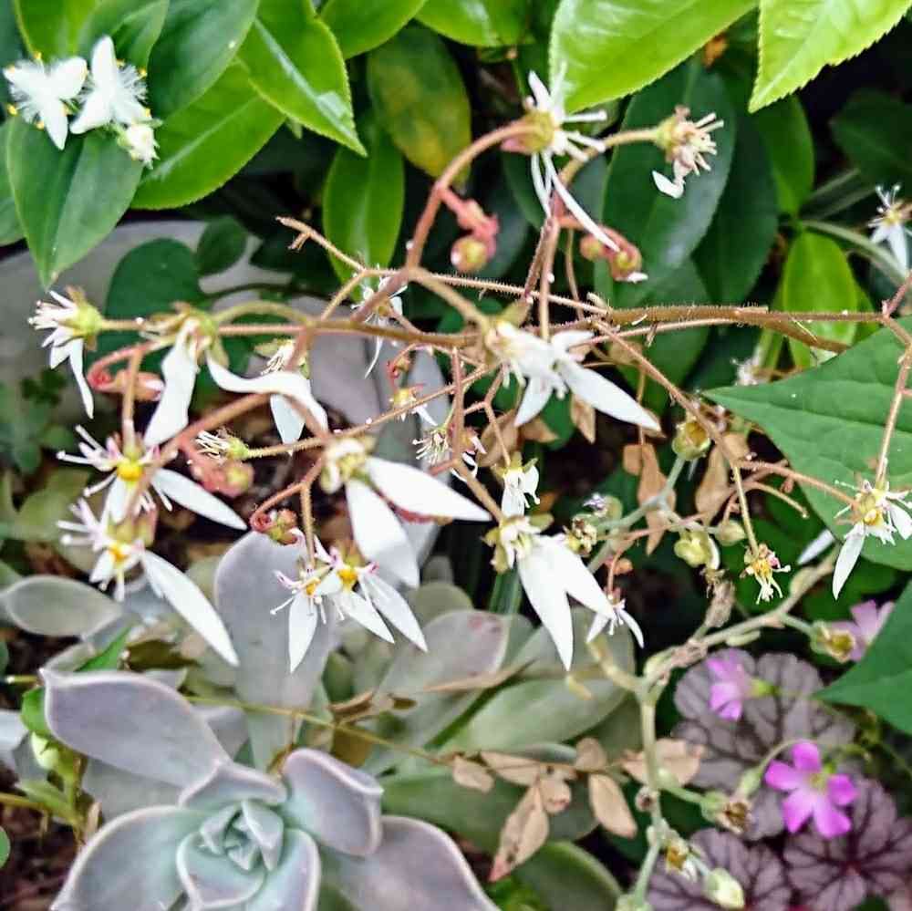 こんばんは。ユキノシタの花です💕。そして、多肉さんとあと…モロモロです♪。ゴチャゴチャしてて🙏。七種類くらい、入ってる(((^_^;)。
