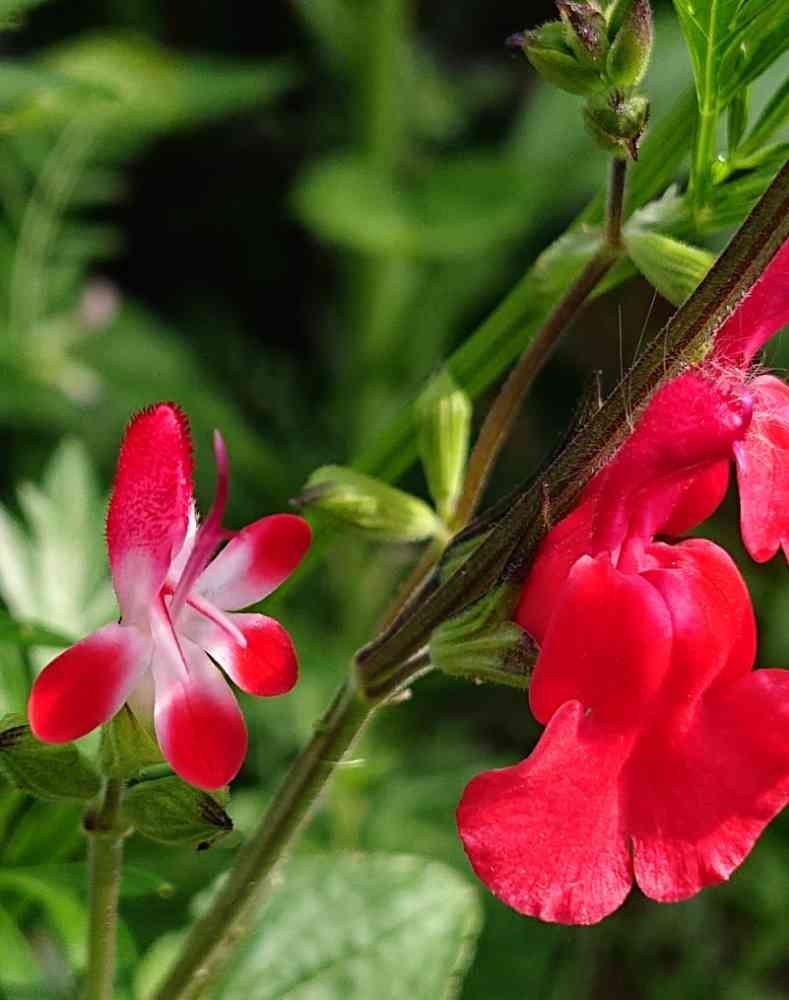 チェリーセージ開花してます。左の花がいつもと違う姿。突然変異❔同じ株なのに不思議です🤔。
