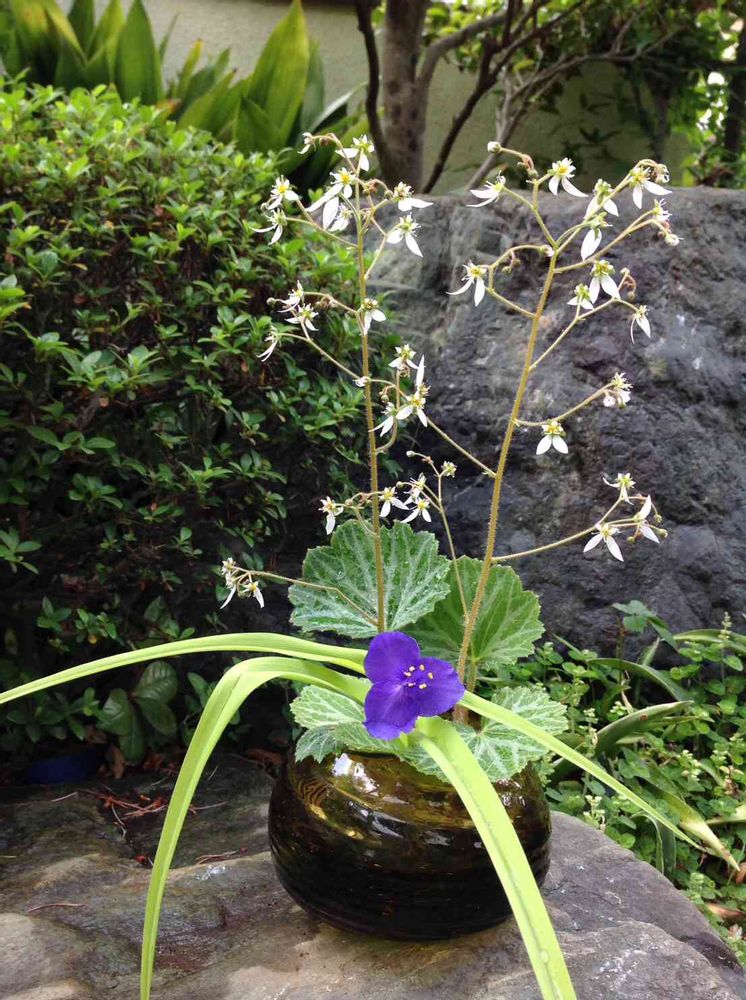 ぐるっと 庭を 廻ったら、このムラサキツユクサ🌱を 見つけました。 とっさに この 2つを 合わせましたが、出来上がるまで 私も どんなのが 出来上がるのか 分かりません、、、最後に 完成して、それが 楽しいのかも知れません.....