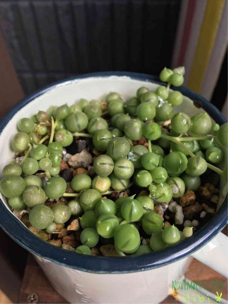 ここのところ忙しかったから外の子たちの様子を見てたらブリキマグのグリネに一個花芽がついてたーー❤️グリネを育て始めてから1年経ったけど、花は咲いたことなかったから楽しみ😆