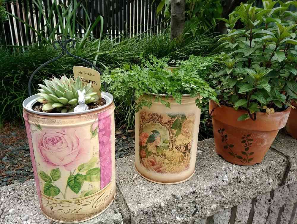 ミルク缶にデコパージュして、左側は多肉を真ん中はハーブ・チャービル入れました🌱
