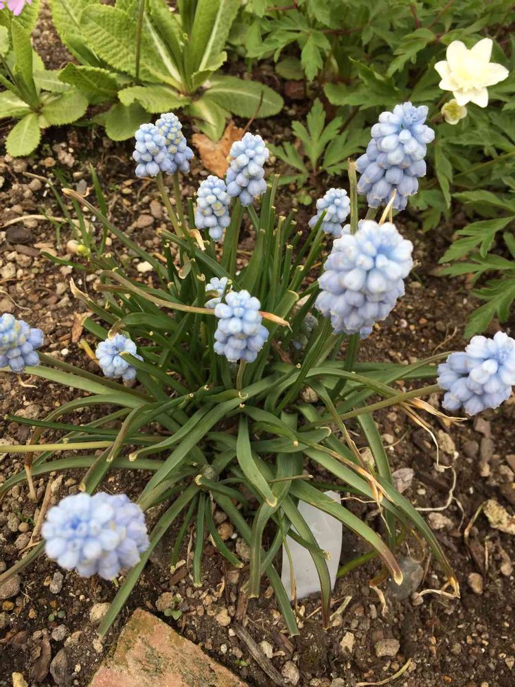 春に咲いたムスカリ、今また葉っぱが茂ってきました!紫もまとまって咲いてると鮮やかで目を惹きますよね!水色はほんわかした雰囲気でしょうか⁇