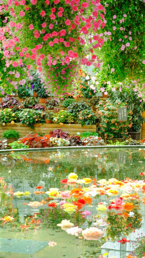 😸にゃばなの里ベゴニア館のプールの水に浮かべてあるベゴニアの花