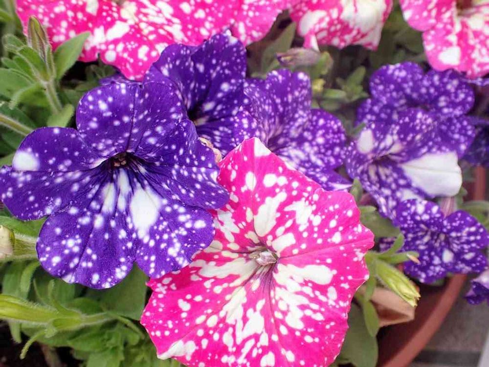 ペチュニア・ナイトスカイと、ベイビードールです。初めてナイトスカイを見たときは衝撃でした。満天の星のような、名前の通りの花容で、すぐにお迎えしてしまいました😃このタイプの模様は、ウイルス病を想起するから嫌いという人もいて、かなり好みが分かれるみたいですが、定番人気になっているようなので好きな人も多いんだなと、うれしくなります😁ピンクのベイビードールは後から出てきた姉妹品種のようで、かわいらしい印象です。ナイトスカイのほうは冬越ししてまた咲いてくれましたが、ベイビードールとともにまたお迎えしてしまいました♪好きなお花なので多めにあってもうれしいですから(*^^*)