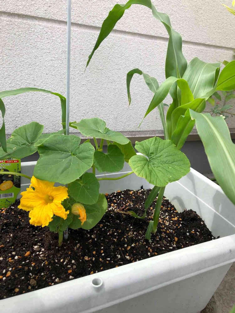 ミニカボチャ栗坊の花が咲きました😊お隣はトウモロコシ🌽コンパニオンプランツに挑戦中✨
