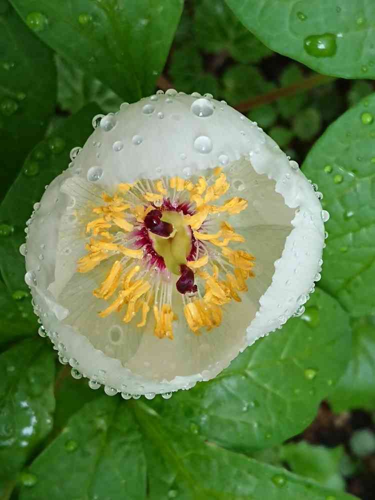 雨滴を帯びたヤマシャクヤクの白いお花🌼🌿