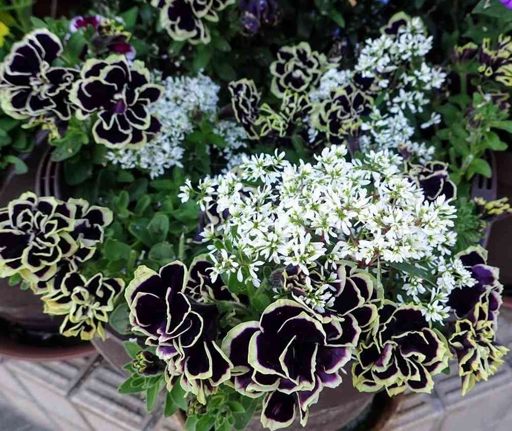 ペチュニア「花衣・黒真珠」です。ユーフォルビア・ダイアモンドスターと寄せ植えにしてます。植えてからひと月くらいたって大分咲いてきました😺もう少しこんもりしてくれるといいなー(*^▽^*)