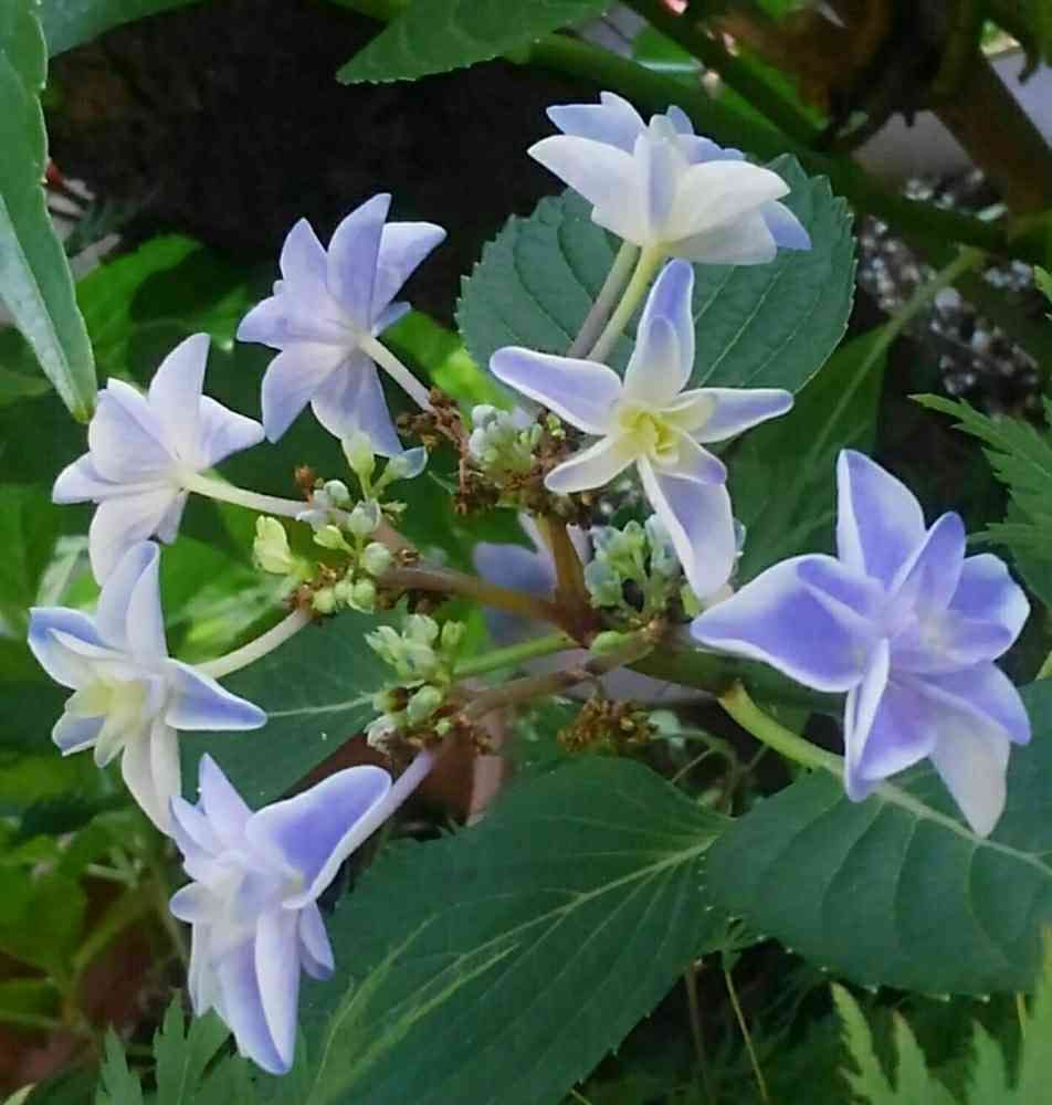 もとは、ガクアジサイの改良なのですが……購入した株によって 中心がコンモリになったり、八重でなく 一重になったりと……かなり気紛れな花みたい‼️ およそ で目にすると、ウチのと違う⁉️となる事もしばしばです😅