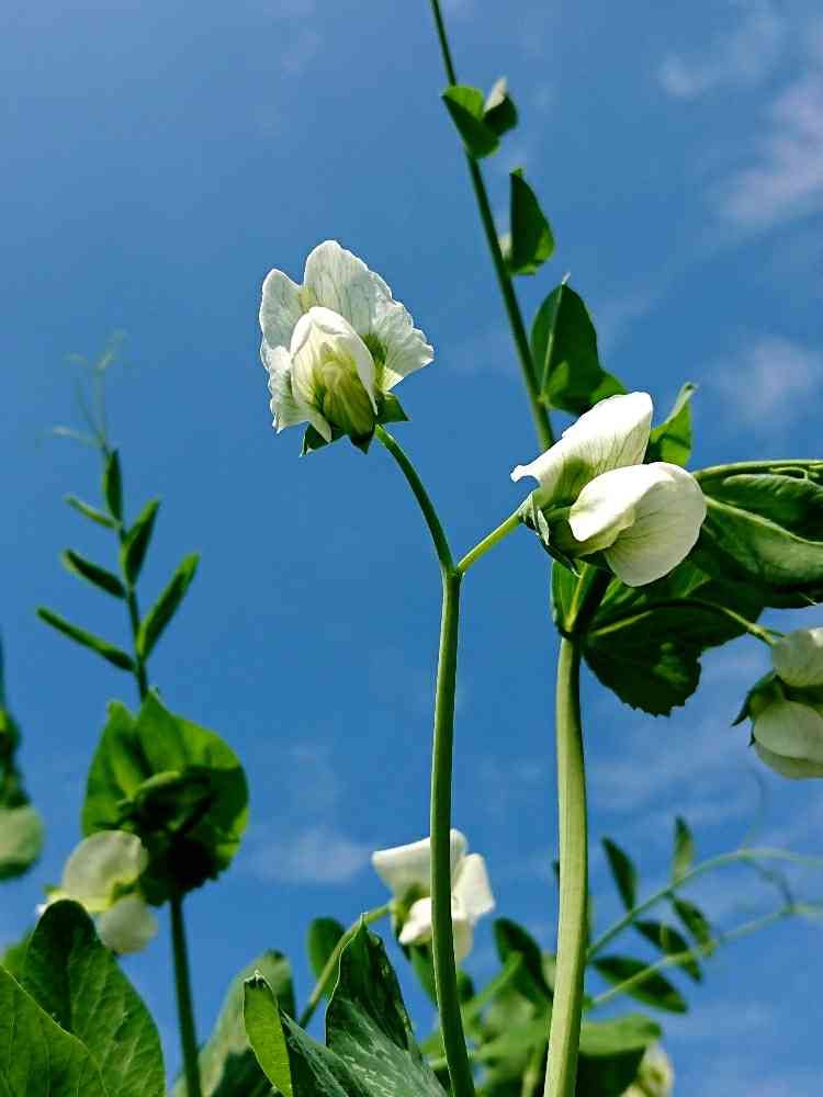グリンピースの花が、青空バックに咲いています。キレイです。