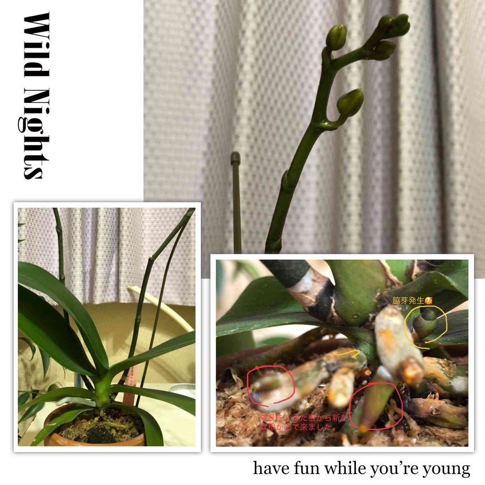 右下の写真、成長が止まってしまった根から新しい根が伸びだし、株元に脇芽?次の花芽?どちらかが、出ました🥰