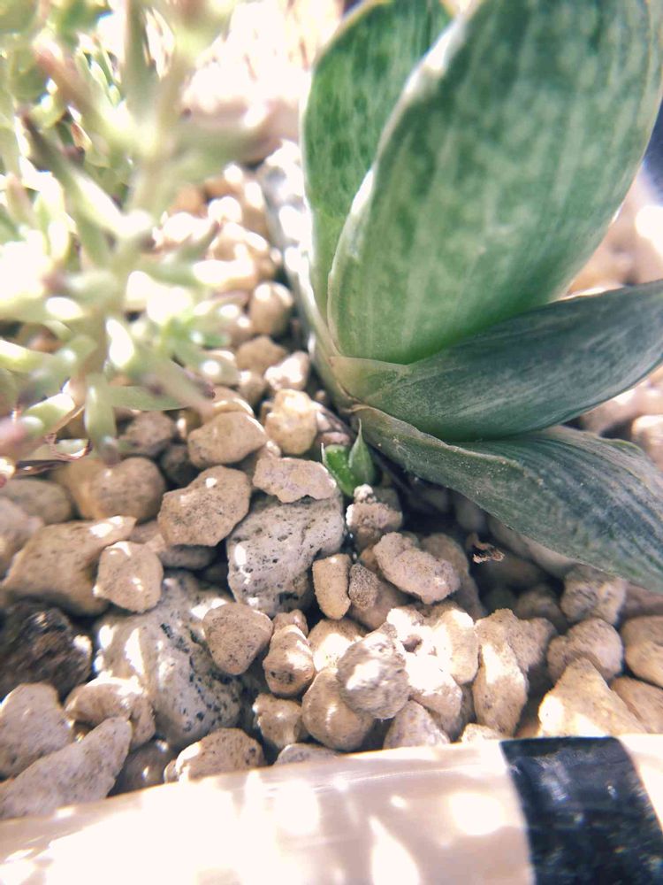 来た時から細く短い根が2本だけで、心配だったガステリア。よく見たら小さい株が😳
