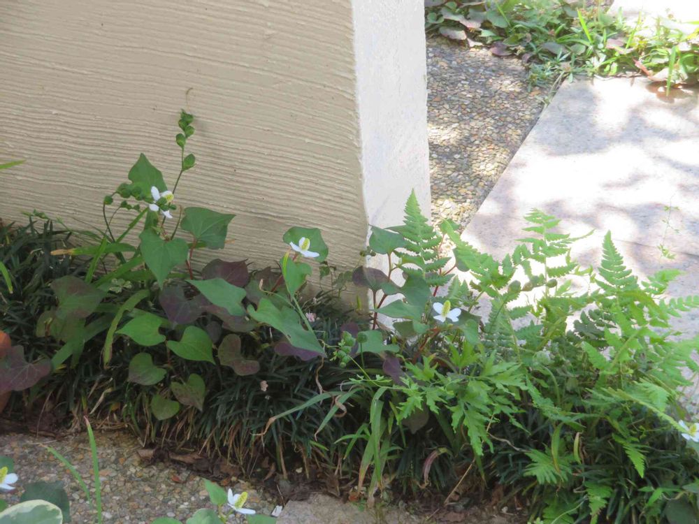 リュウノヒゲの植え込みの間から色々な草が顔をだす♪♪