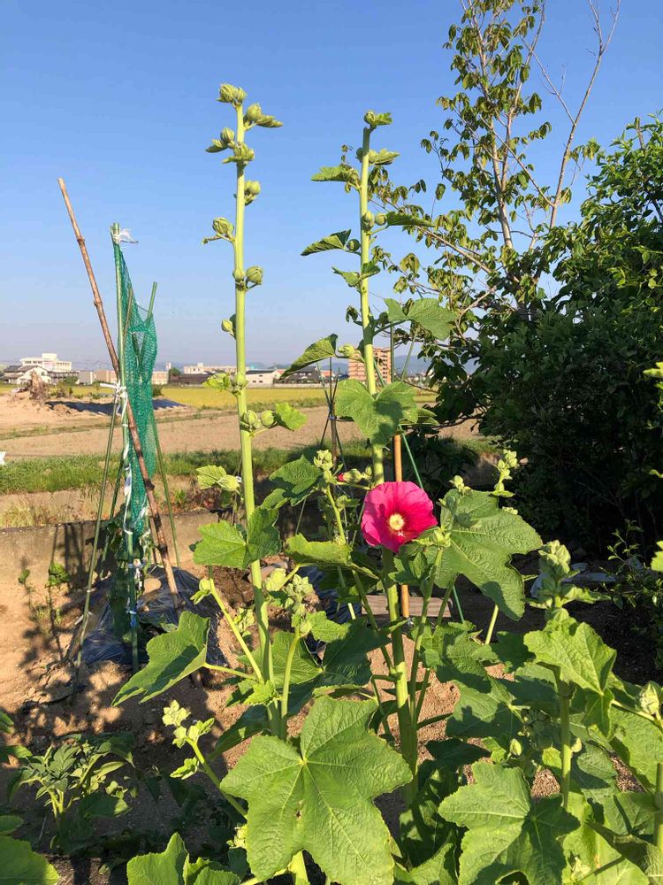 我が家の小さな畑に タチアオイ の花が途中まで咲いています。てっぺんまで咲くと 夏 と言われています(^o^)/