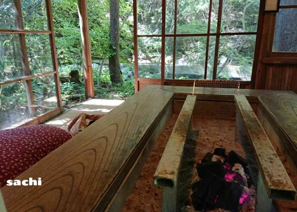 川の見えるスペシャルな席でせせらぎを聞きながら、目の前の炭火で焼きながら…