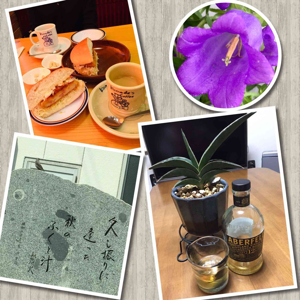 ↪️食堂に飾られていた涼やかな花🌸、喫茶店でコロッケバンズ一つを半分こ♡、近所のフク販売店の山頭火歌碑の上ですまし顔のシロハラさん🐦、アバフェルディとロブスタブルー😻